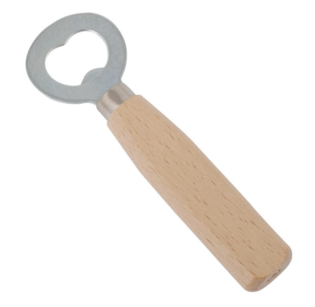 Un décapsuleur en métal et avec un manche en bois de hêtre pour ouvrir les bouteilles.