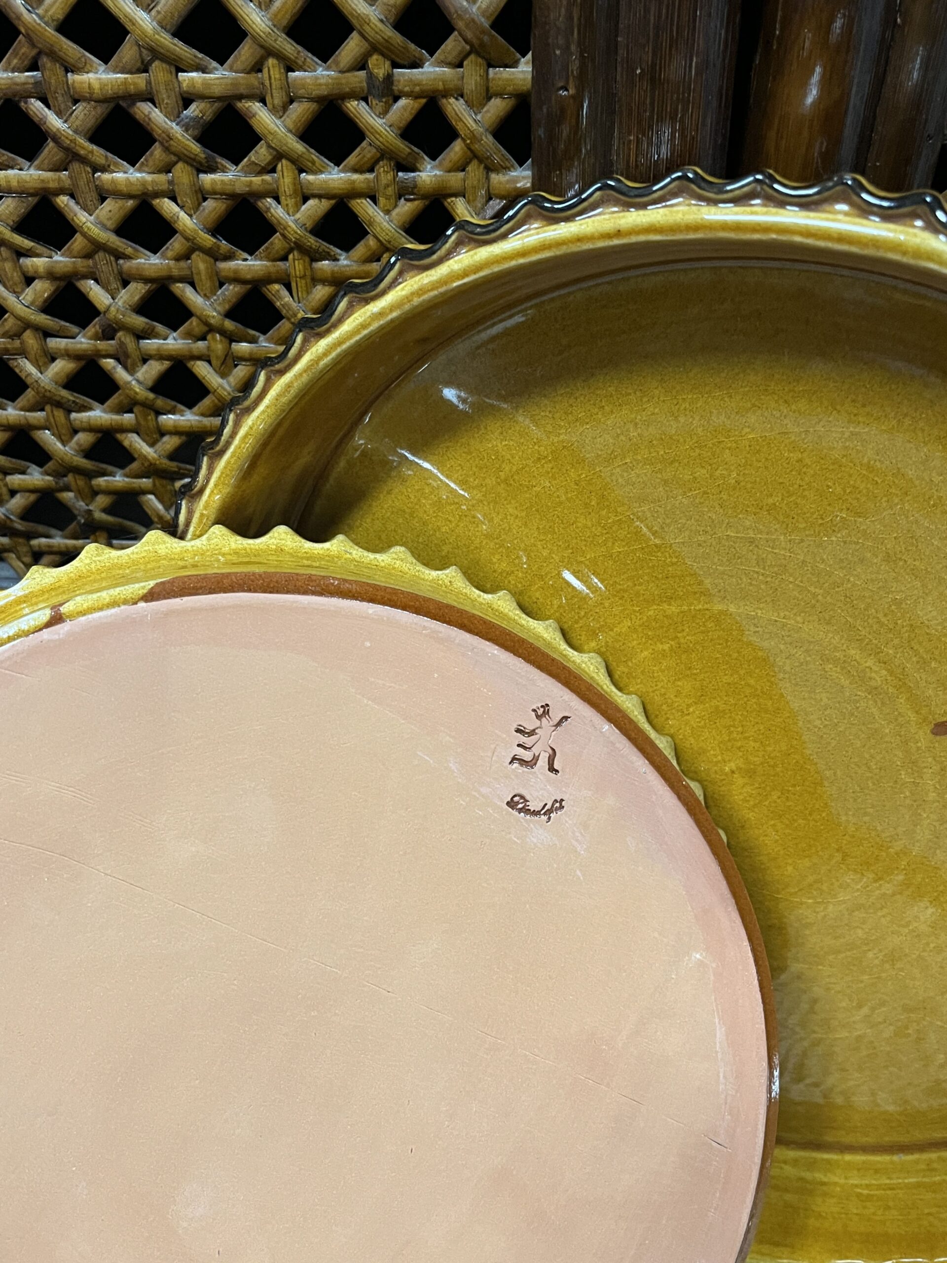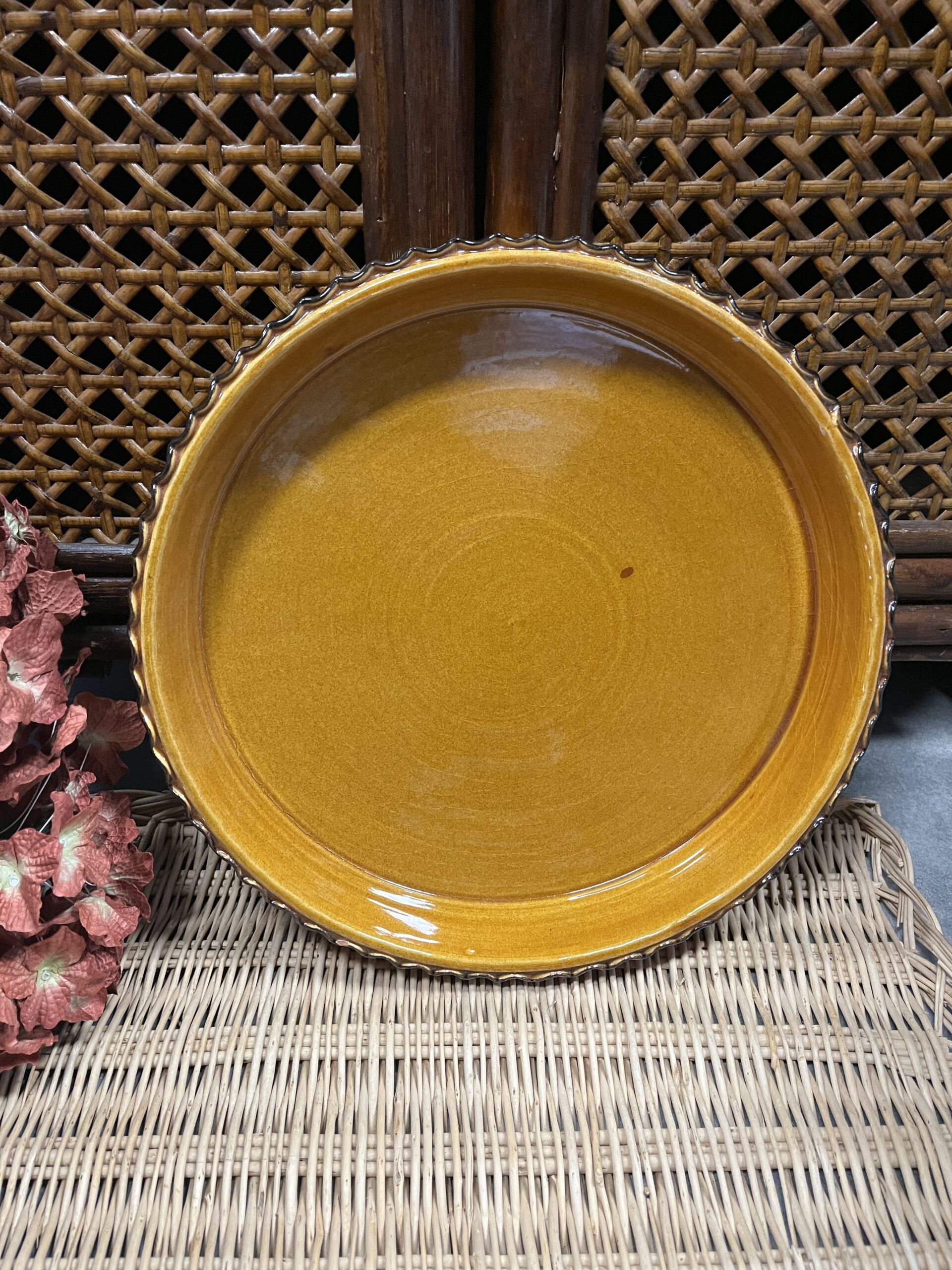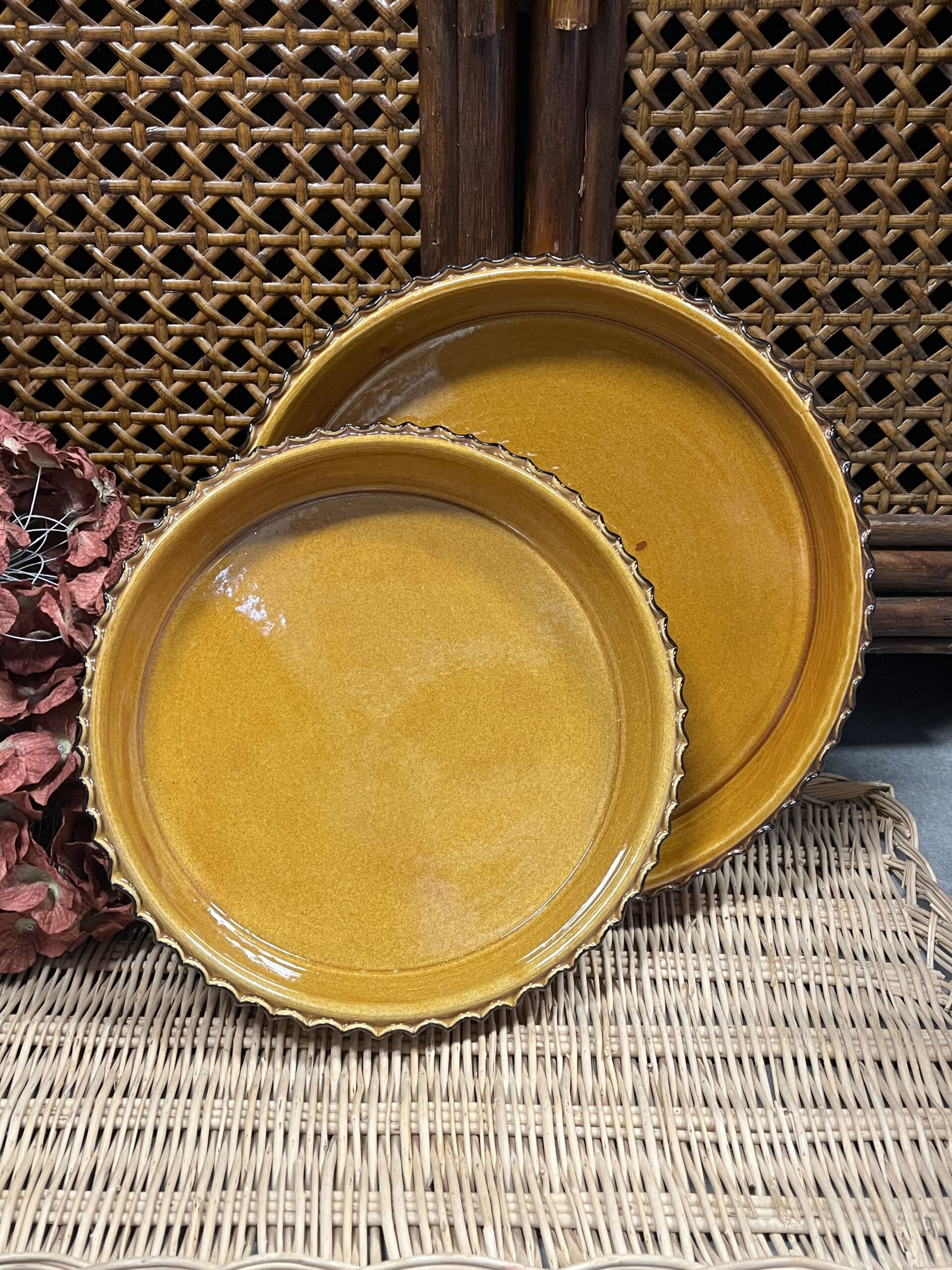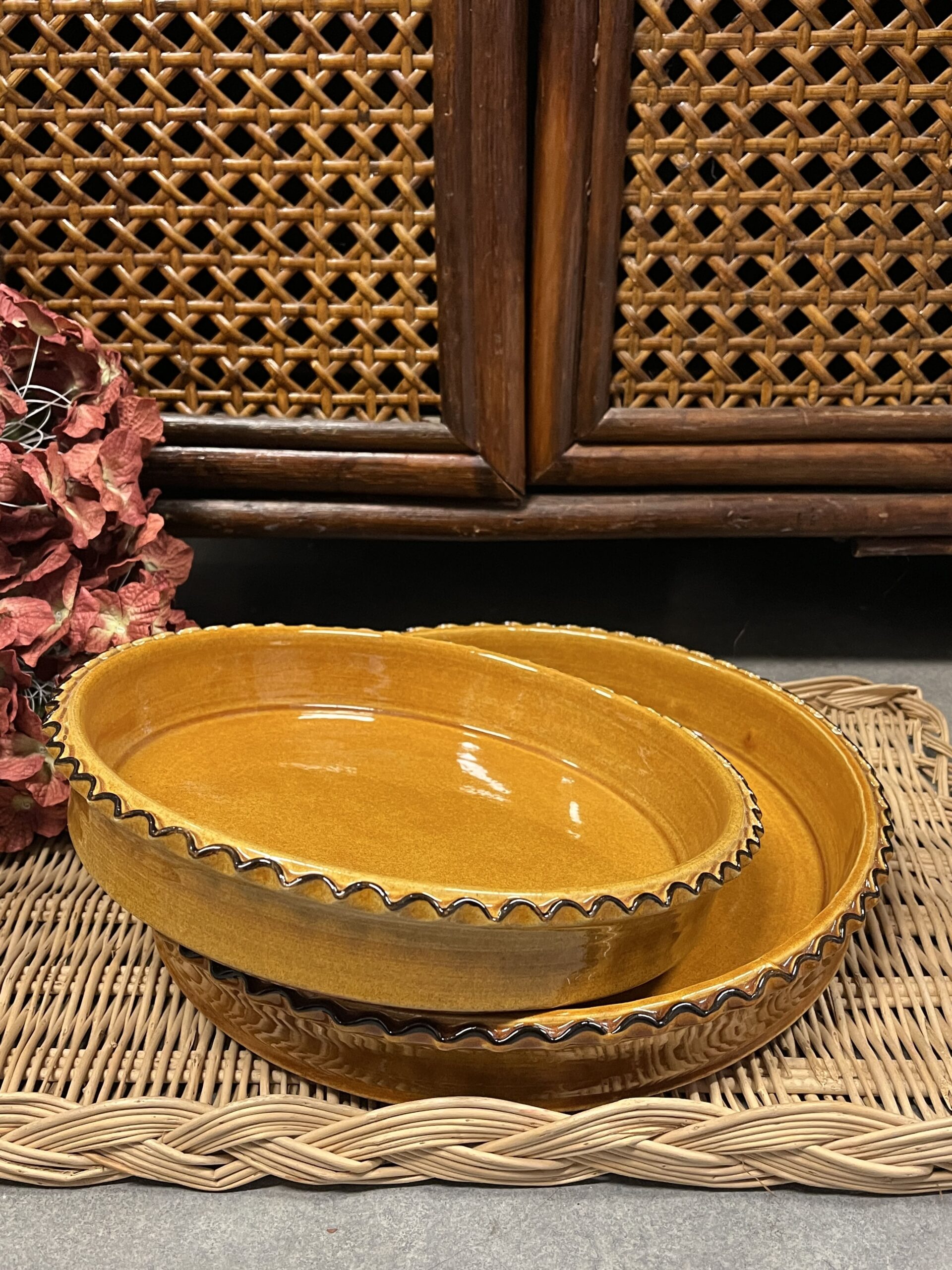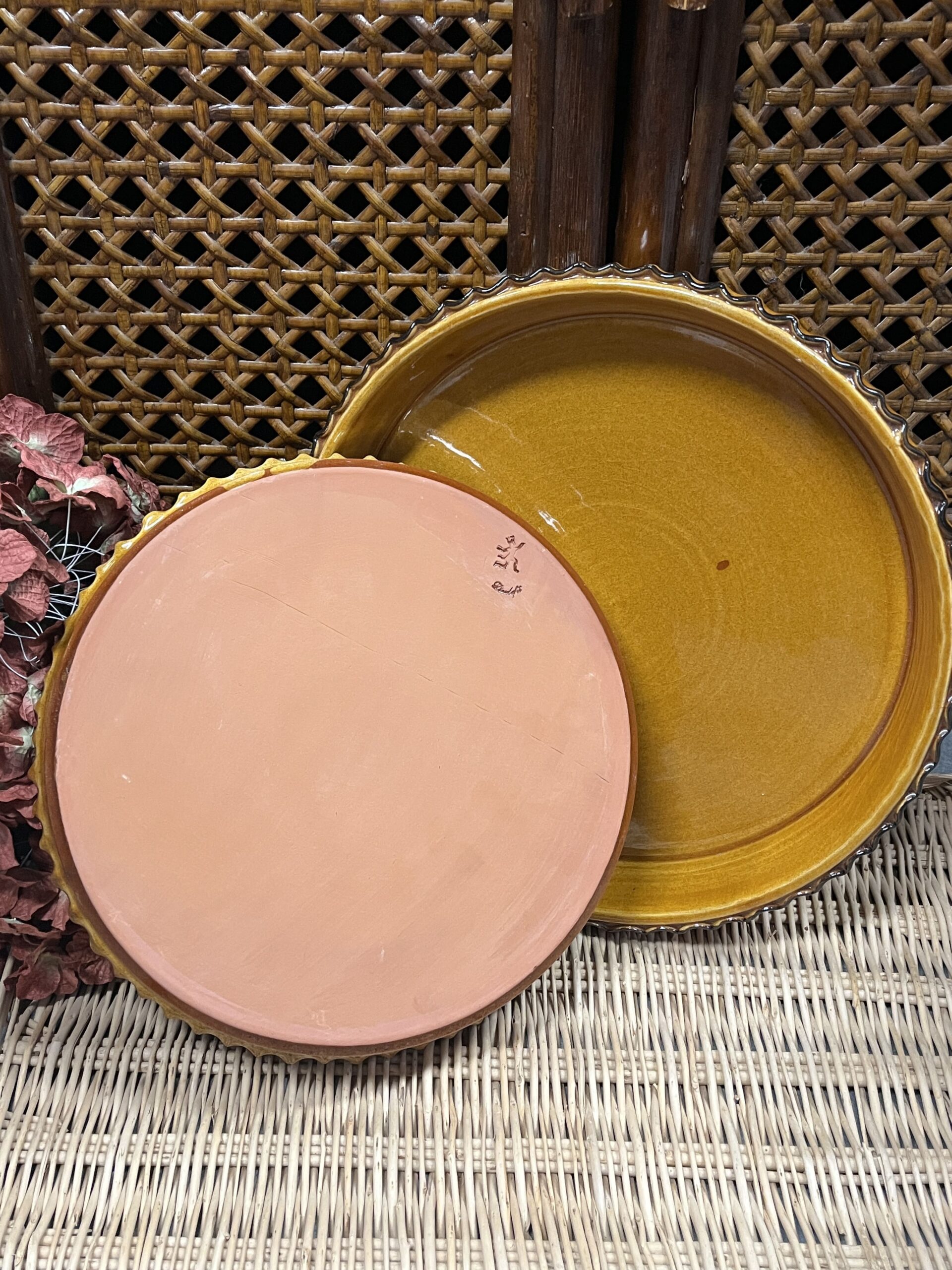 Moule à tarte en céramique fabriqué artisanalement et tourné à la main par la Poterie Dieulefit. Émaillé de couleur miel, coloris typique du village de Dieulefit. Ce moule à tarte est disponibles en deux tailles. Il est intégralement réalisé à la main et demande beaucoup d’heures de travail. On peut apercevoir les empruntes du doigt du potier à la base de l’objet lors du processus d’émaillage. La frise est réalisée et moulée au doigt.