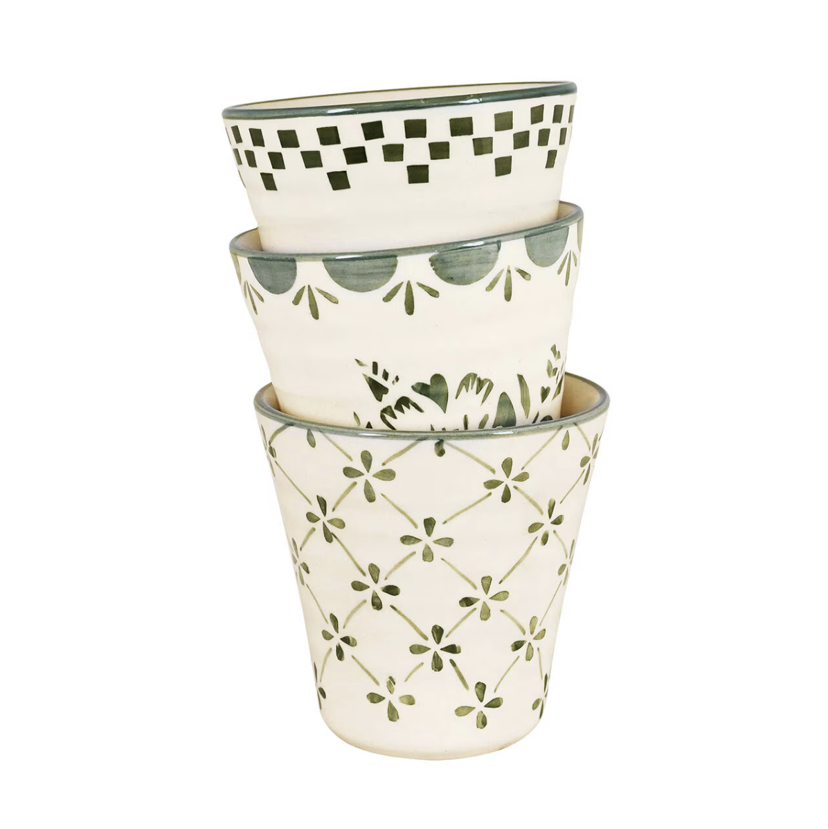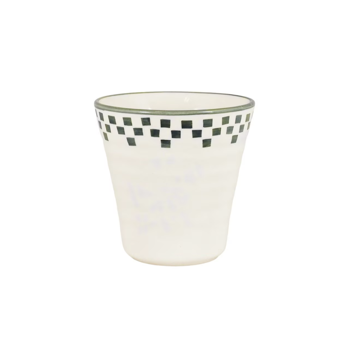 Mug en céramique de la marque suédoise Strömshaga avec un motif à l’ancienne à petits carreaux.