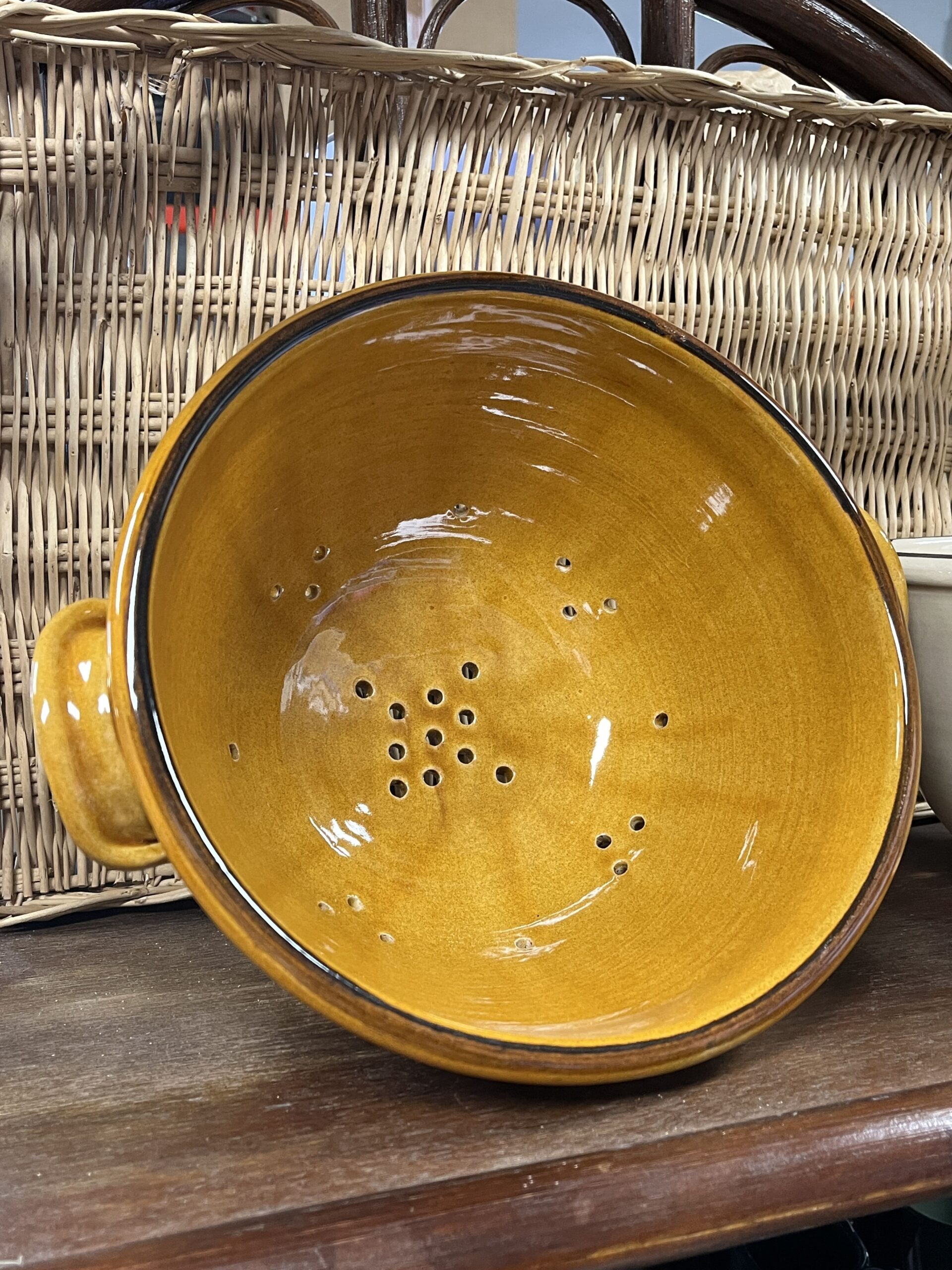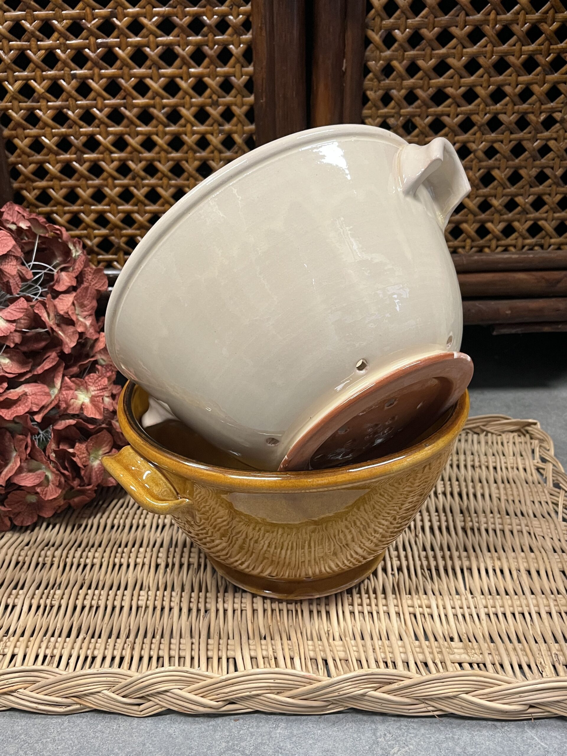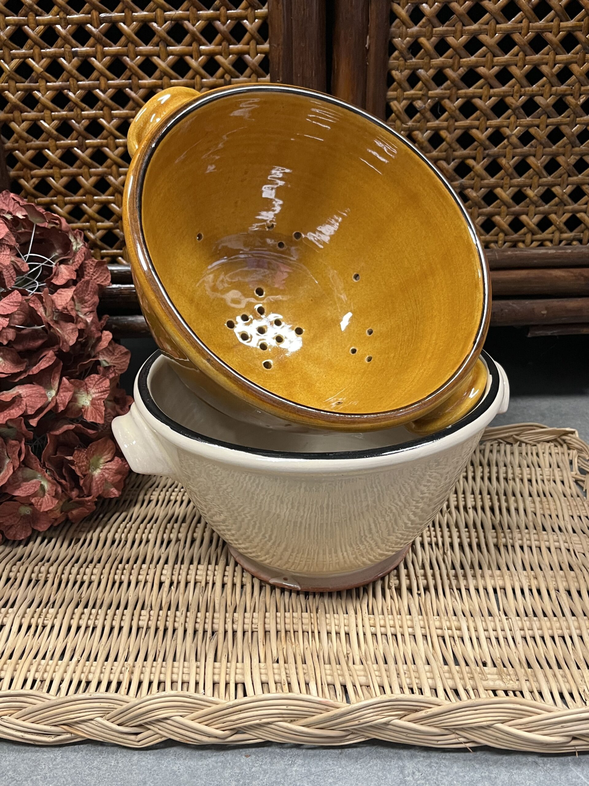 Grande passoire en céramique fabriquée artisanalement et tournée à la main par la Poterie Dieulefit. Émaillée de couleur beige ou de couleur miel, typique du village de Dieulefit. Cette passoire est intégralement réalisée à la main et demande beaucoup d’heures de travail. On peut apercevoir les empruntes du doigt du potier à la base de l’objet lors du processus d’émaillage.
