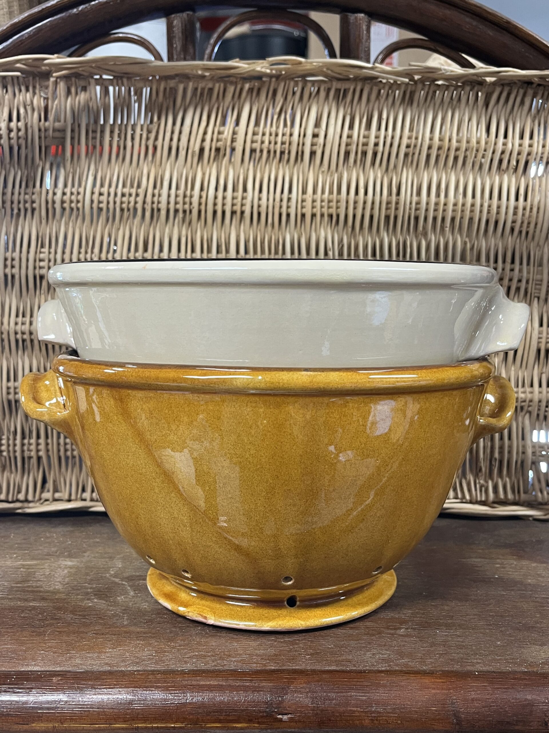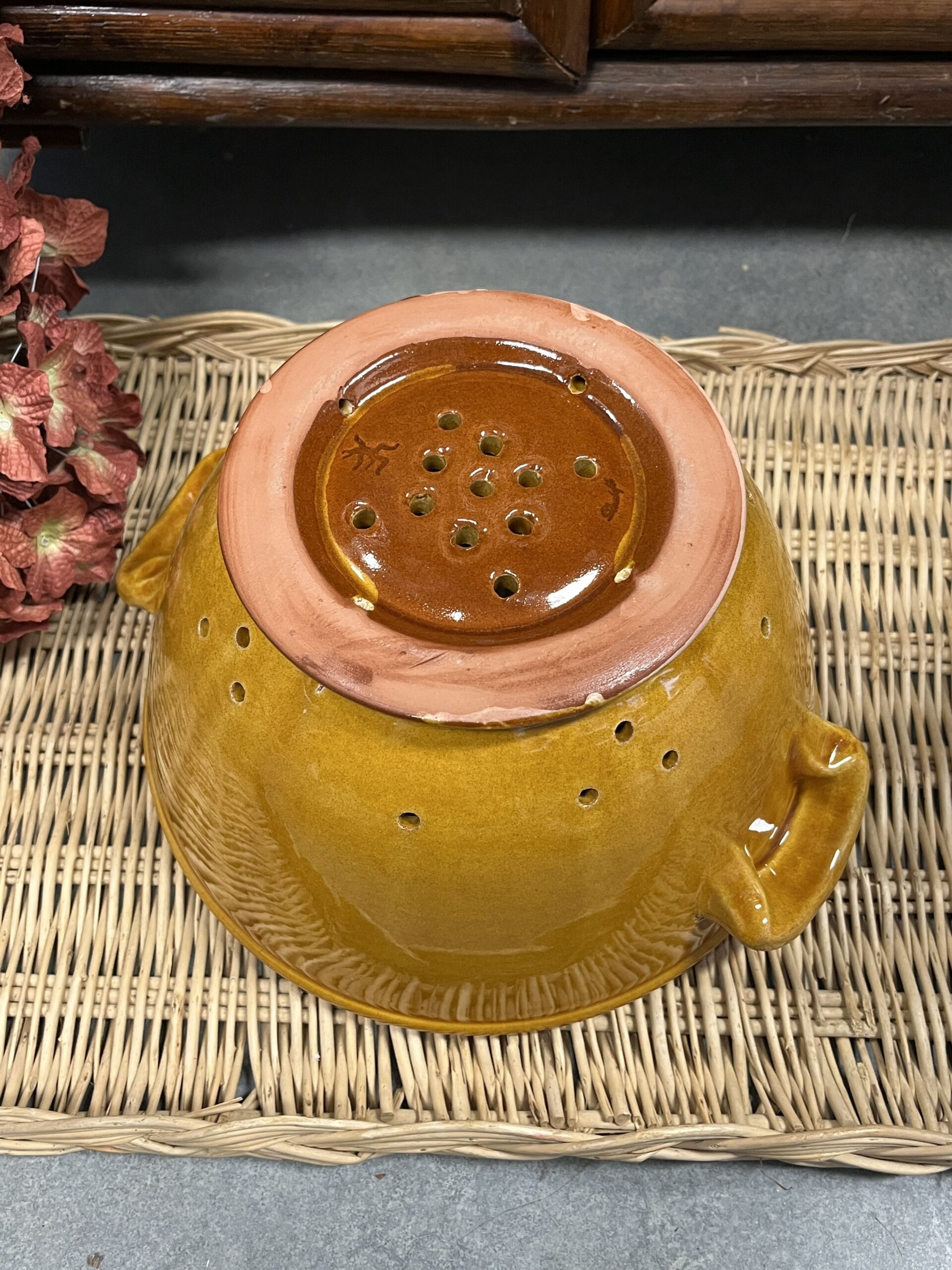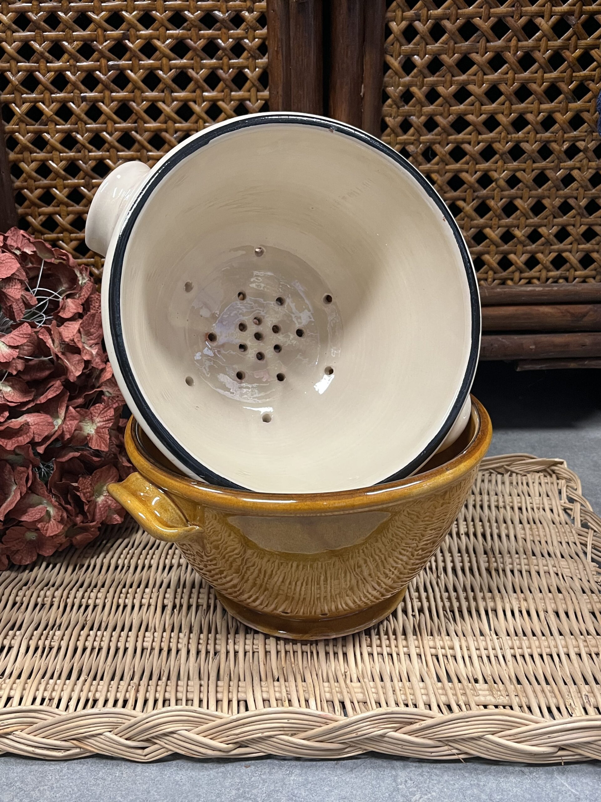 Grande passoire en céramique fabriquée artisanalement et tournée à la main par la Poterie Dieulefit. Émaillée de couleur beige ou de couleur miel, typique du village de Dieulefit. Cette passoire est intégralement réalisée à la main et demande beaucoup d’heures de travail. On peut apercevoir les empruntes du doigt du potier à la base de l’objet lors du processus d’émaillage.