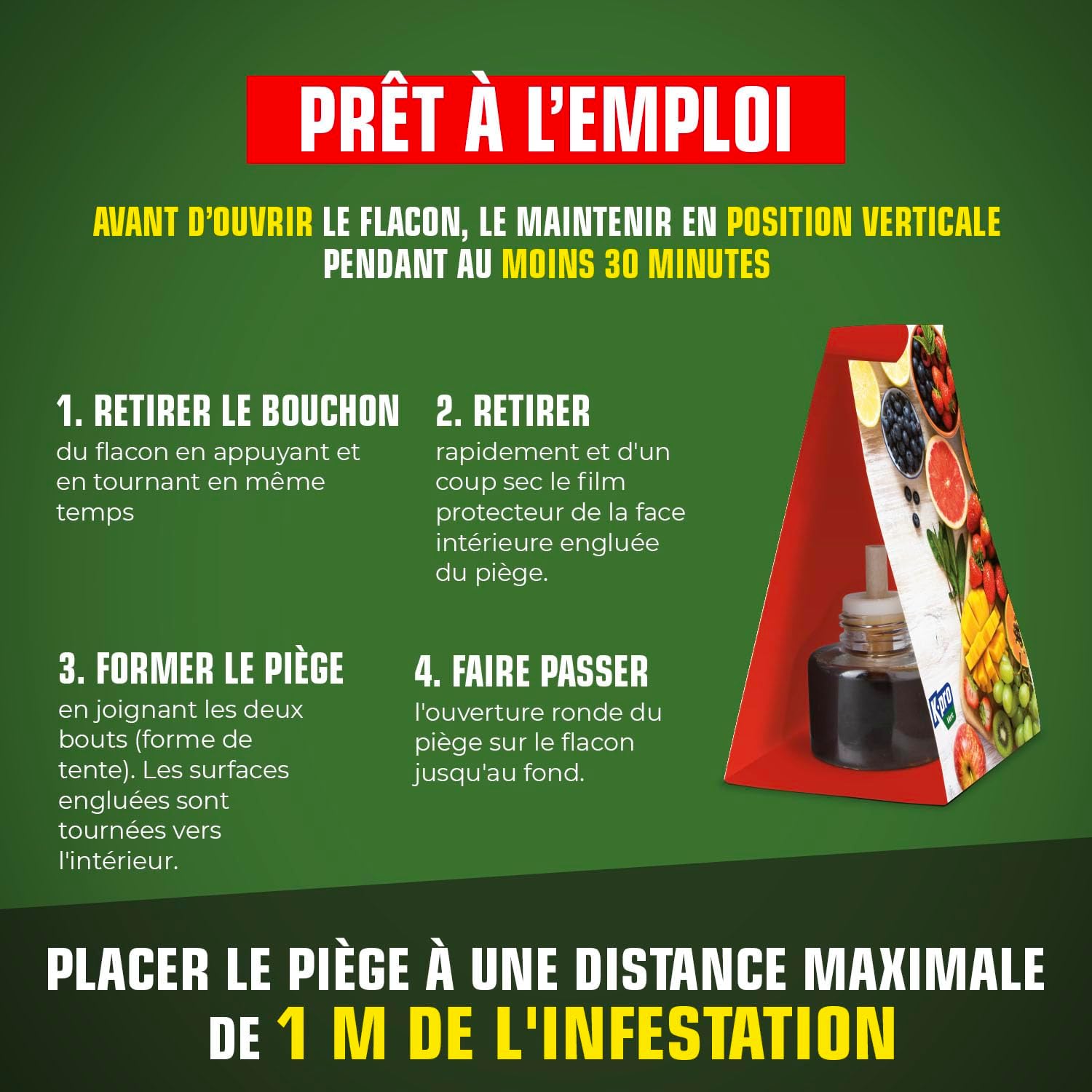 MODE D’EMPLOI : Placer le piège à proximité des corbeilles de fruits et de légumes. Retirer la pellicule protectrice du piège collant. Monter le piège en formant une sorte de tente. Les parties engluées doivent être à l’intérieur.