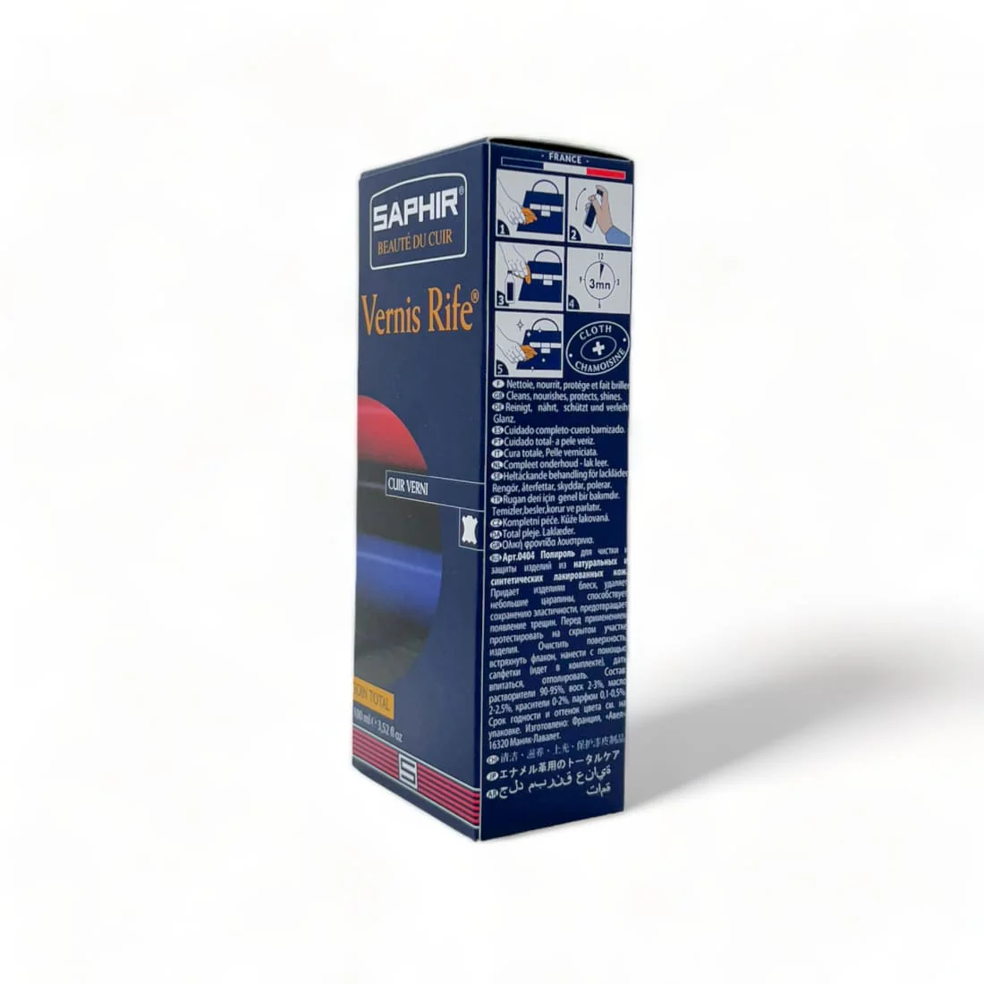 Le Vernis Rife de Saphir est un produit qui nettoie, protège et fait briller tous les cuirs vernis. Protège contre les craquelures et enlève les traces de doigts. Ce produit est incolore et peut-être utilisé sur toutes les couleurs de cuir vernis. Il s’adapte également aux ceintures et aux sacs en cuir verni.