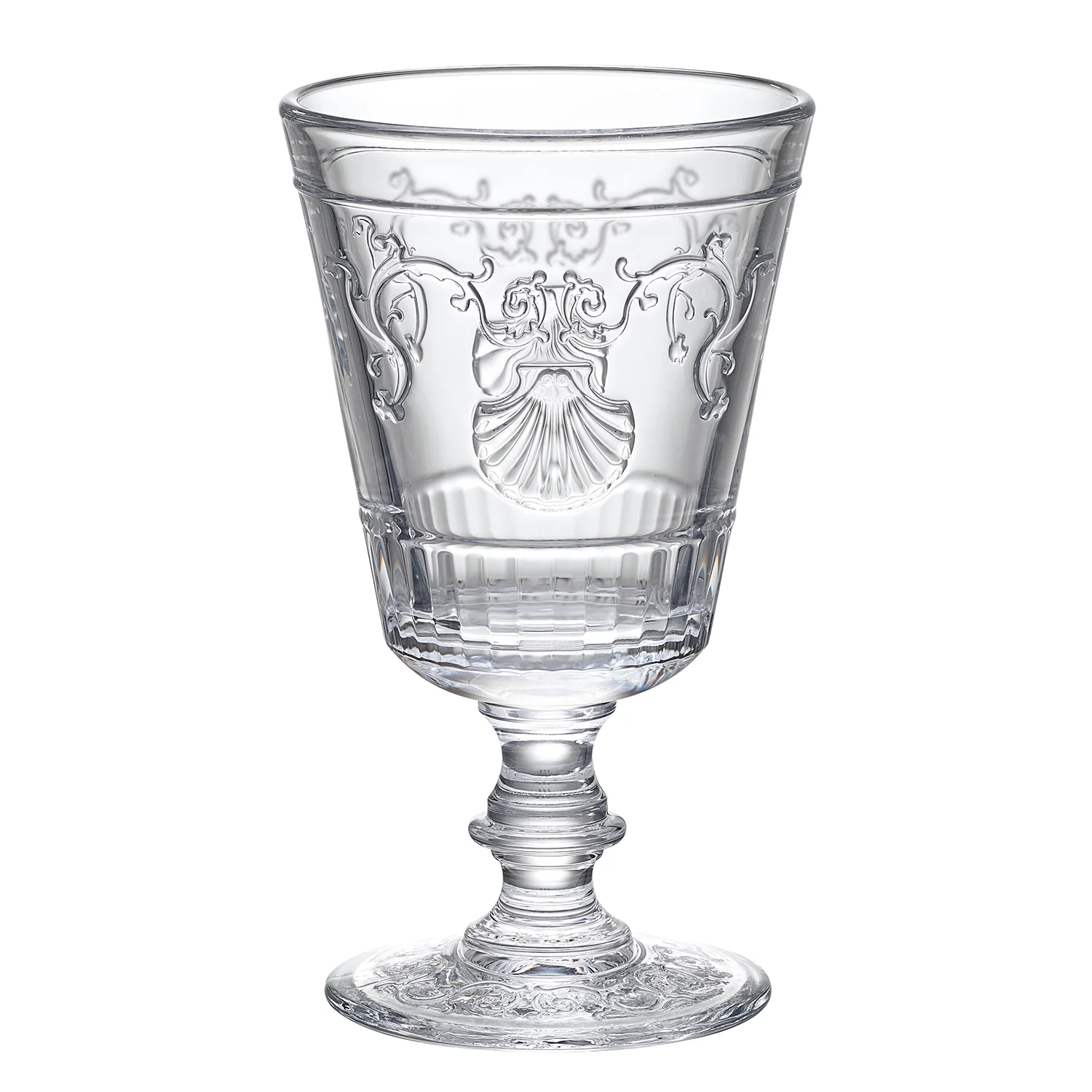 Verre à pied en verre pressé. Jambe à bouton et paraison aux motifs baroques en relief, de volutes, de fleurs et de coquilles Saint-Jacques.